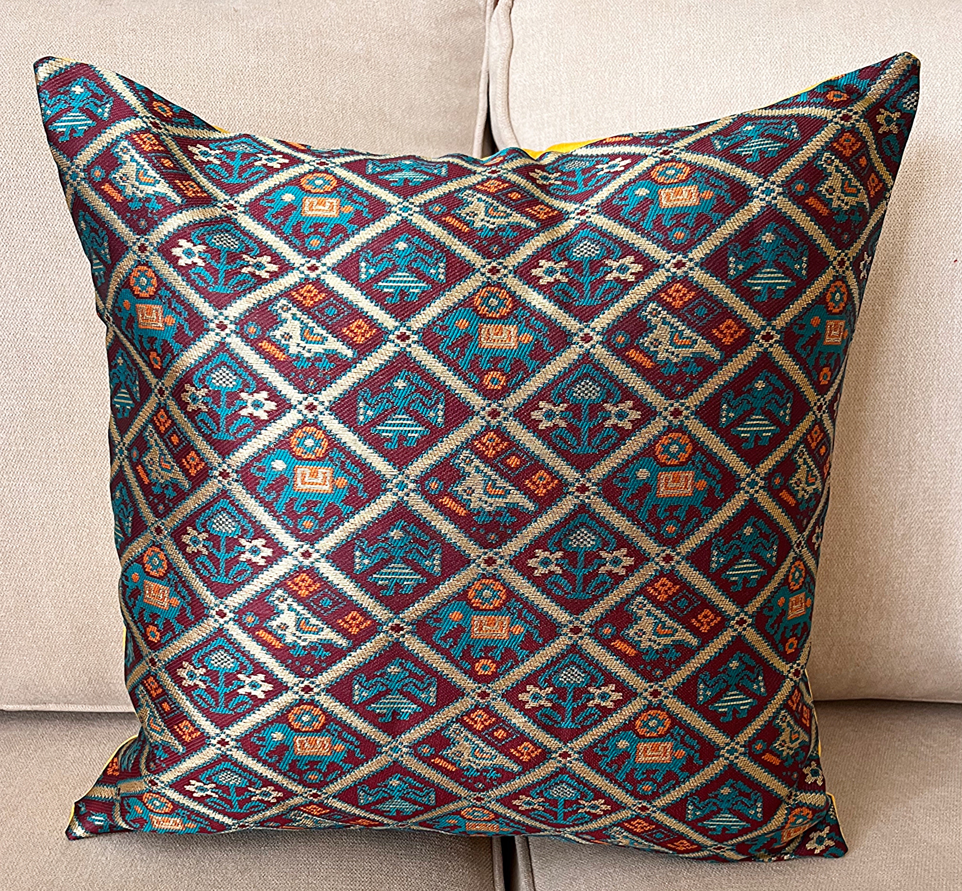 These cushion covers feature the iconic Patola print of Gujarat, known for its intricate geometric motifs and rich heritage.