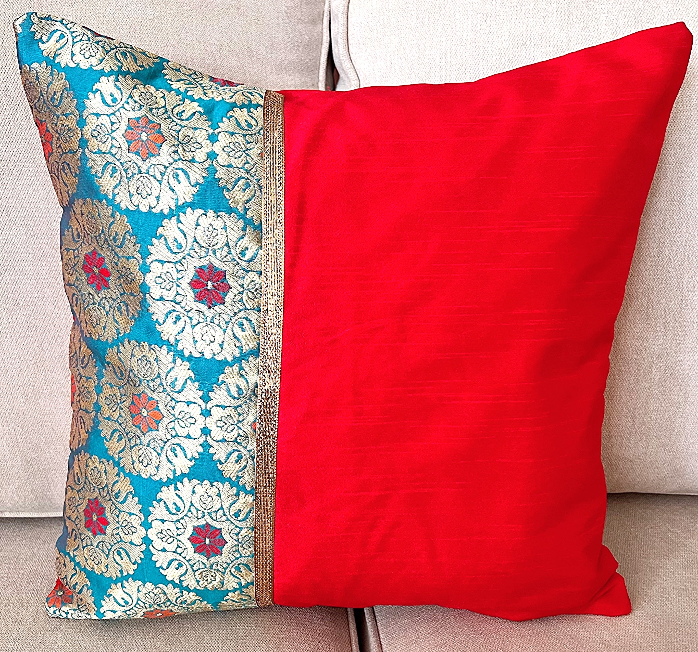 Colour and Description: This cushion cover combines a rich red silk base with an ornate teal and gold patterned border. Intricate floral motifs and a subtle gold border add a touch of traditional elegance. The bold contrast creates a luxurious accent, perfect for elevating any living space.