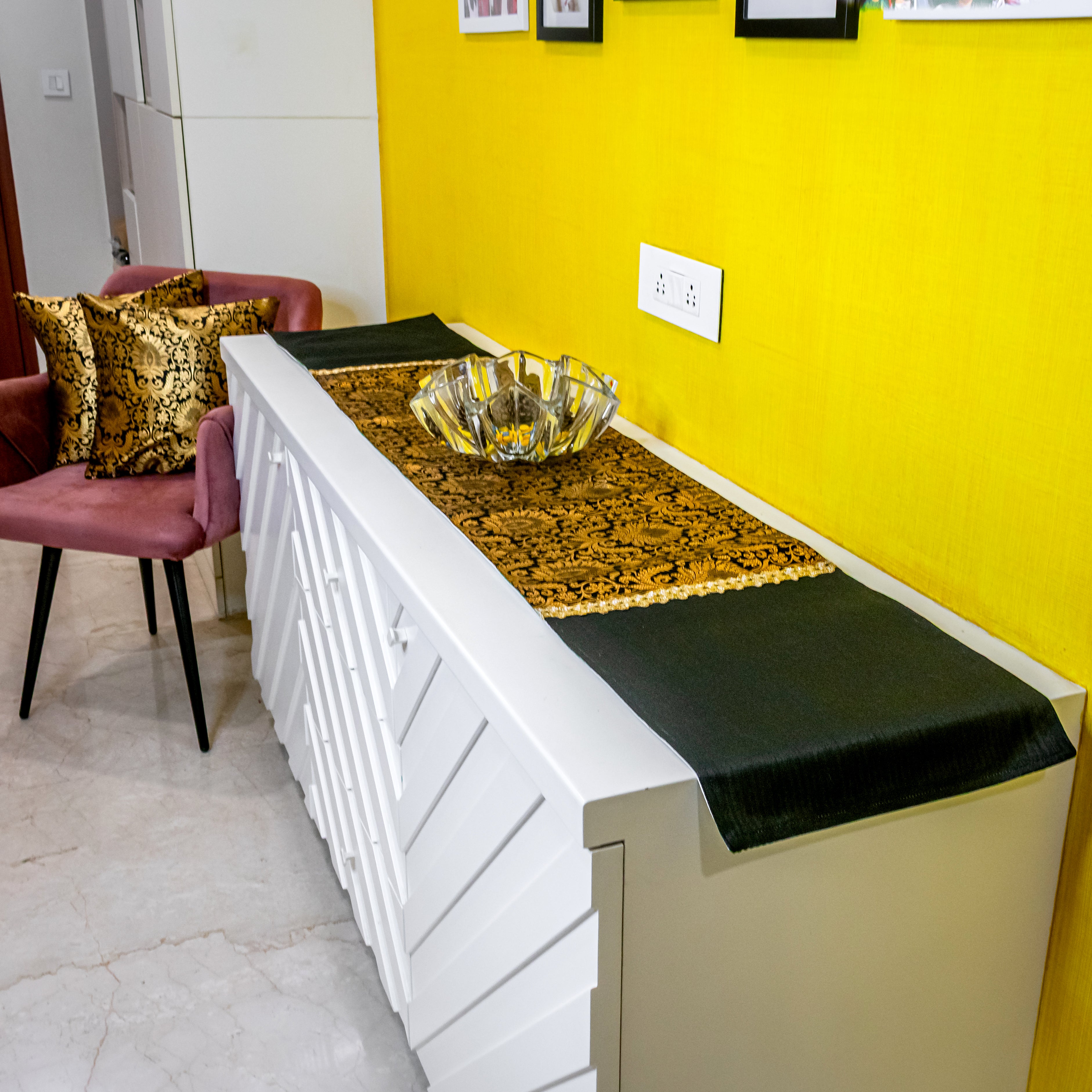 This Banarasi silk table runner features intricate golden embroidery on luxurious black silk, adding a touch of opulence and elegance. Perfect for creating a regal ambiance in any room.
